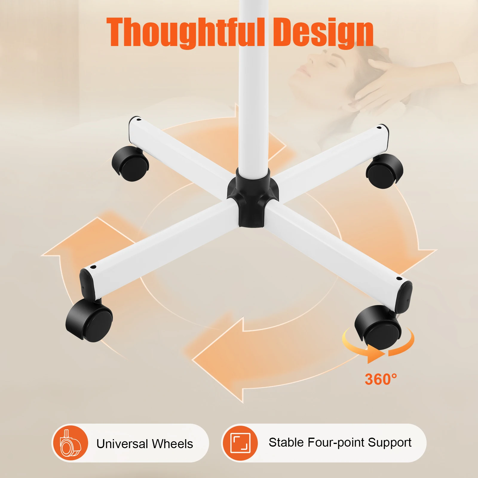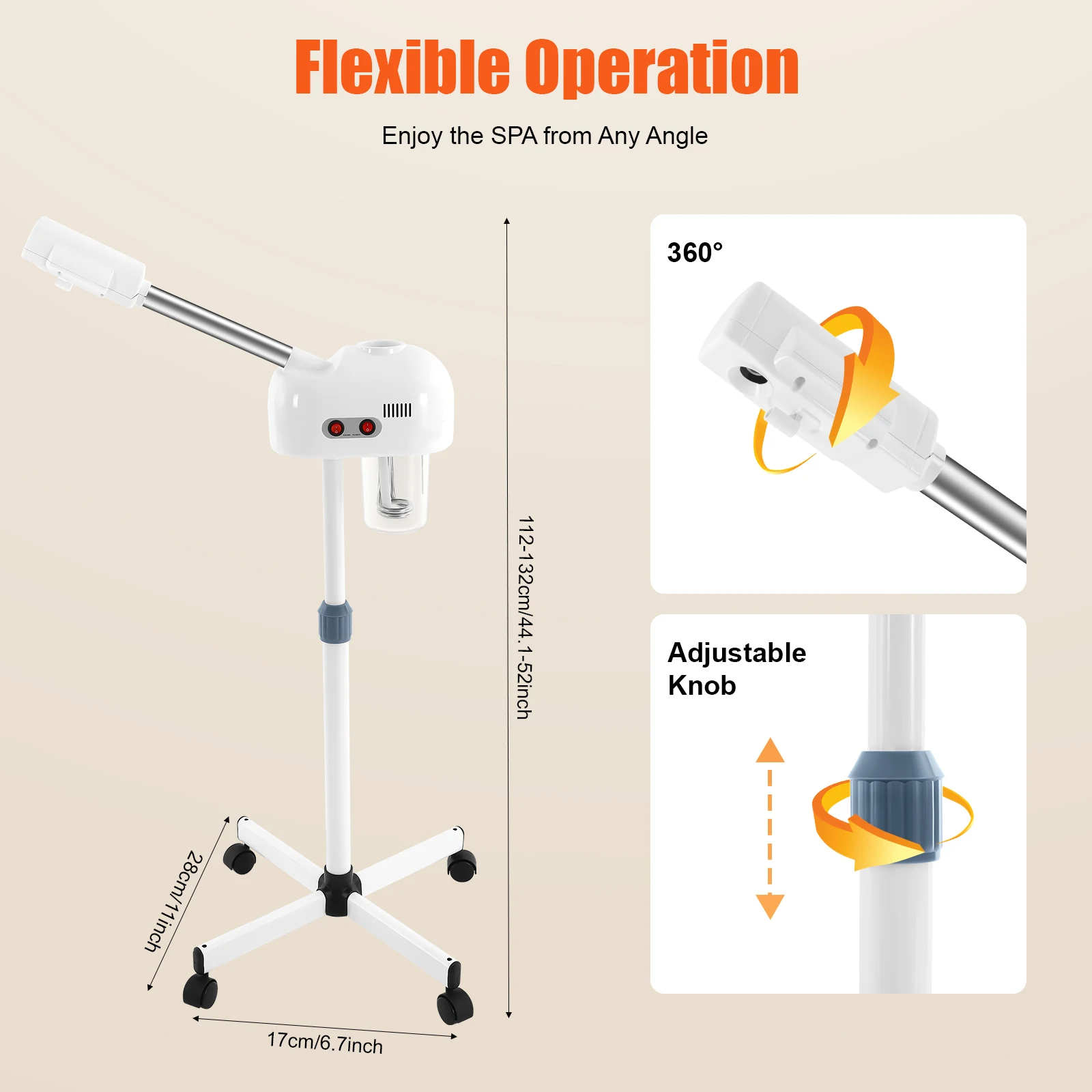 Convenient to Use:Both the body and nozzle can rotate 360°, allowing you to use it when lying, standing, or sitting. The adjustable height (44.1-52in) allows you to change to the appropriate spray height for your convenience.