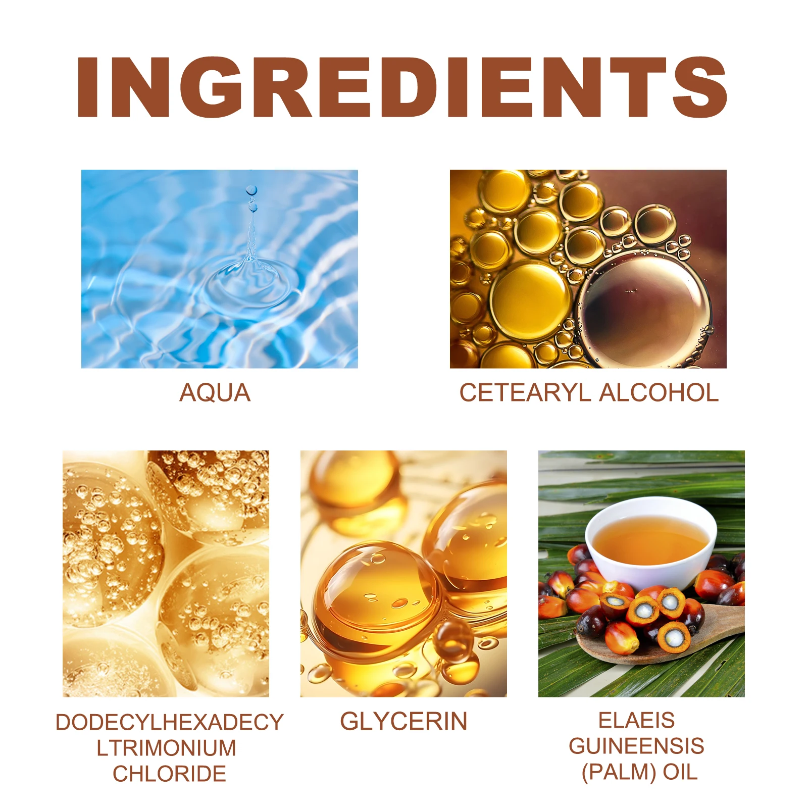 Ingredients: Water, Cetearyl Alcohol, Cetearyl Trimonium Chloride, Glycerin, Palm Oil.