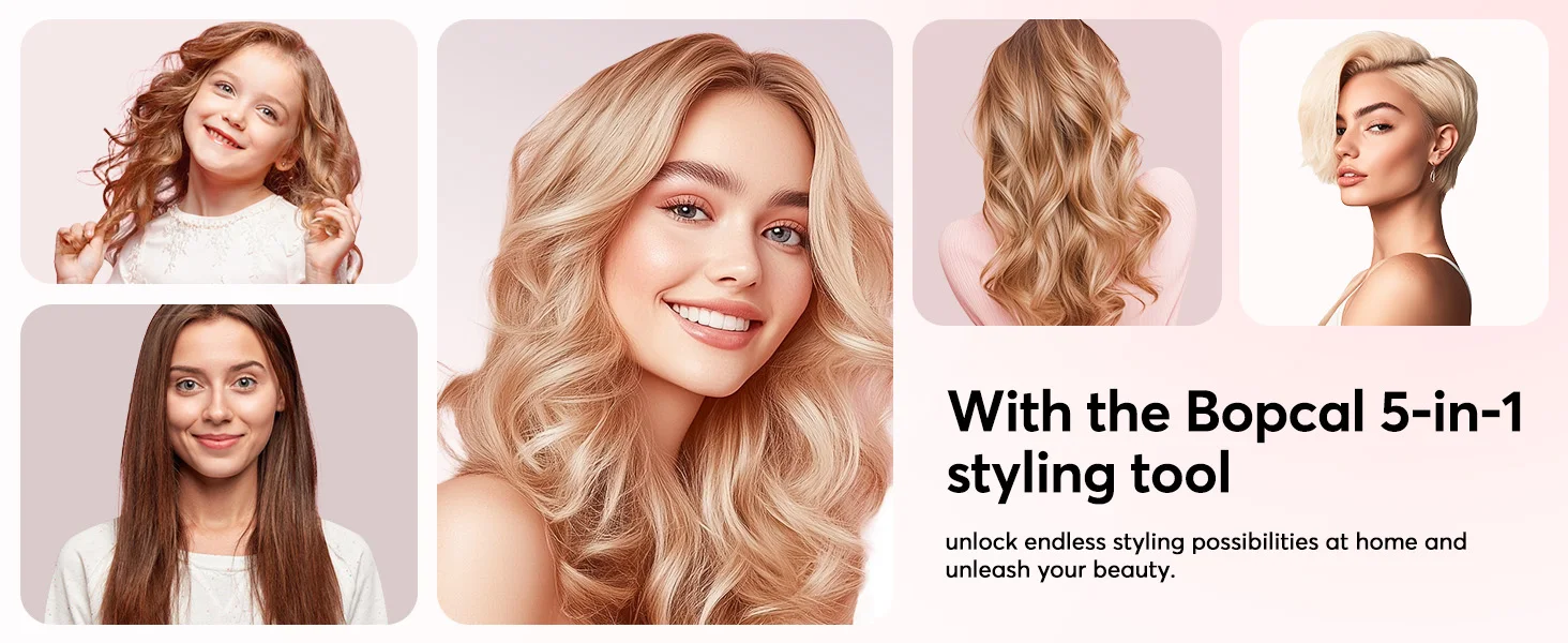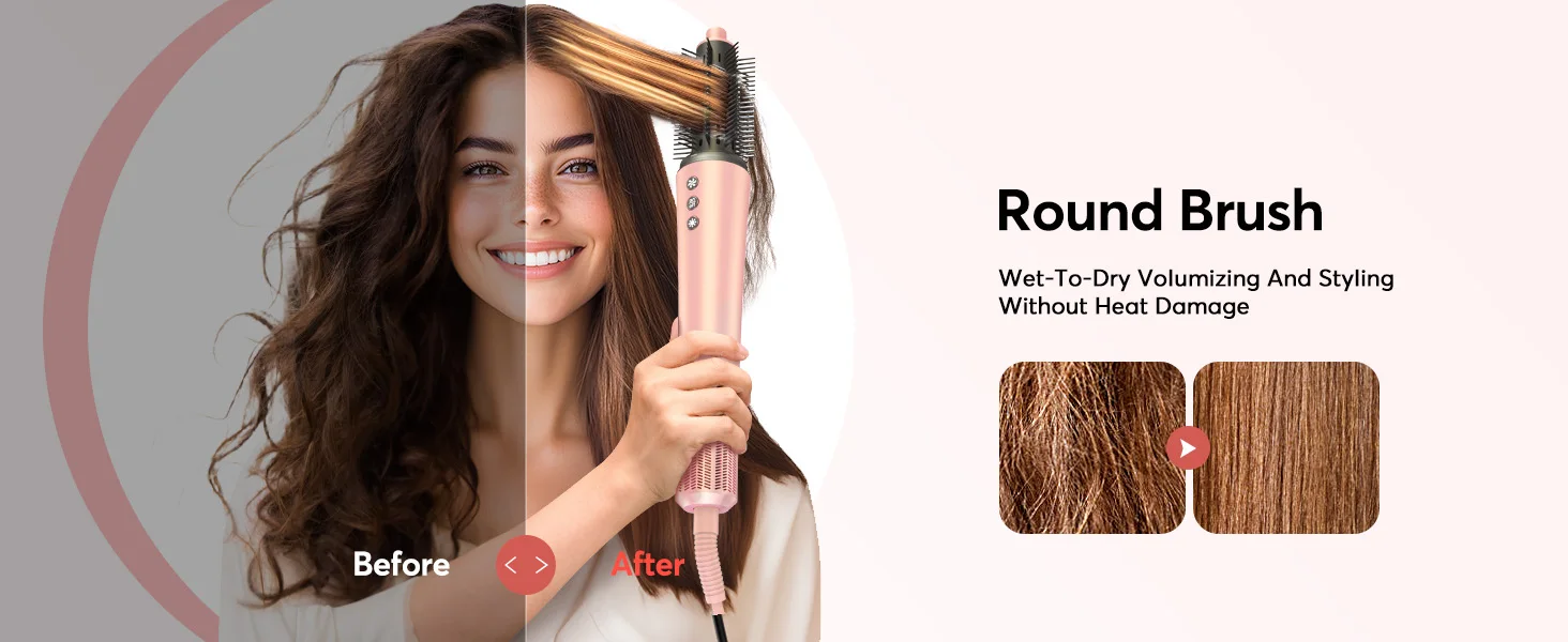【5 in 1 Hair Styler Set】magic styler is a multifunctional styling set that can perfectly meet your various hairstyling needs. The 5 in 1Hair Styler includes 1 hair dryer, 2 air curlers in different directions, 2 hair dryer curler, Can be used as a blow-dryer, curling iron, volumizing brush, bang brush, and straightening brush.