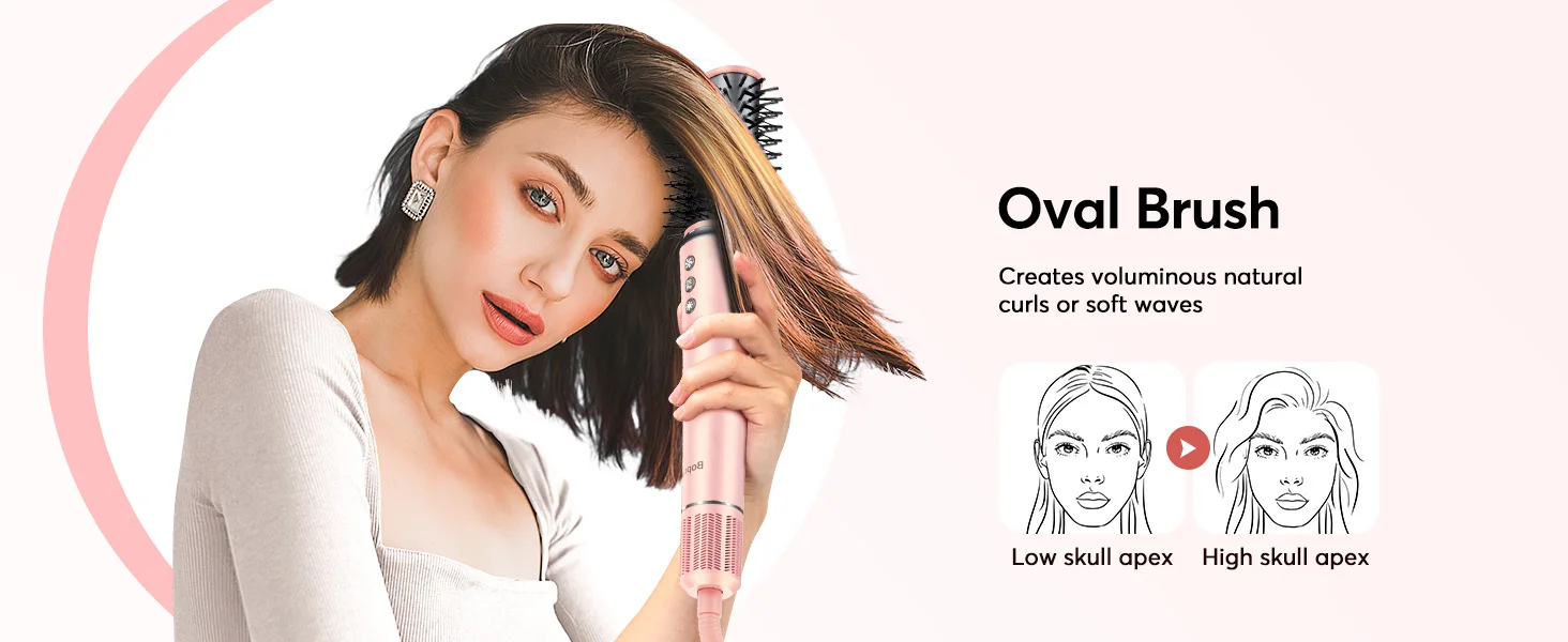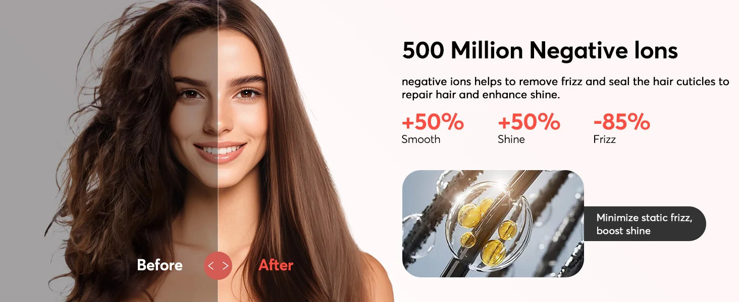 【Ionic Care】Hot Air Styler adopts ceramic coating technology, and the built-in device releases 320 Millionen of negative ion airflows, which can effectively smooth static frizz and increase luster. The airflow with negative ions acts on the hair, making it volumizing and smoother.