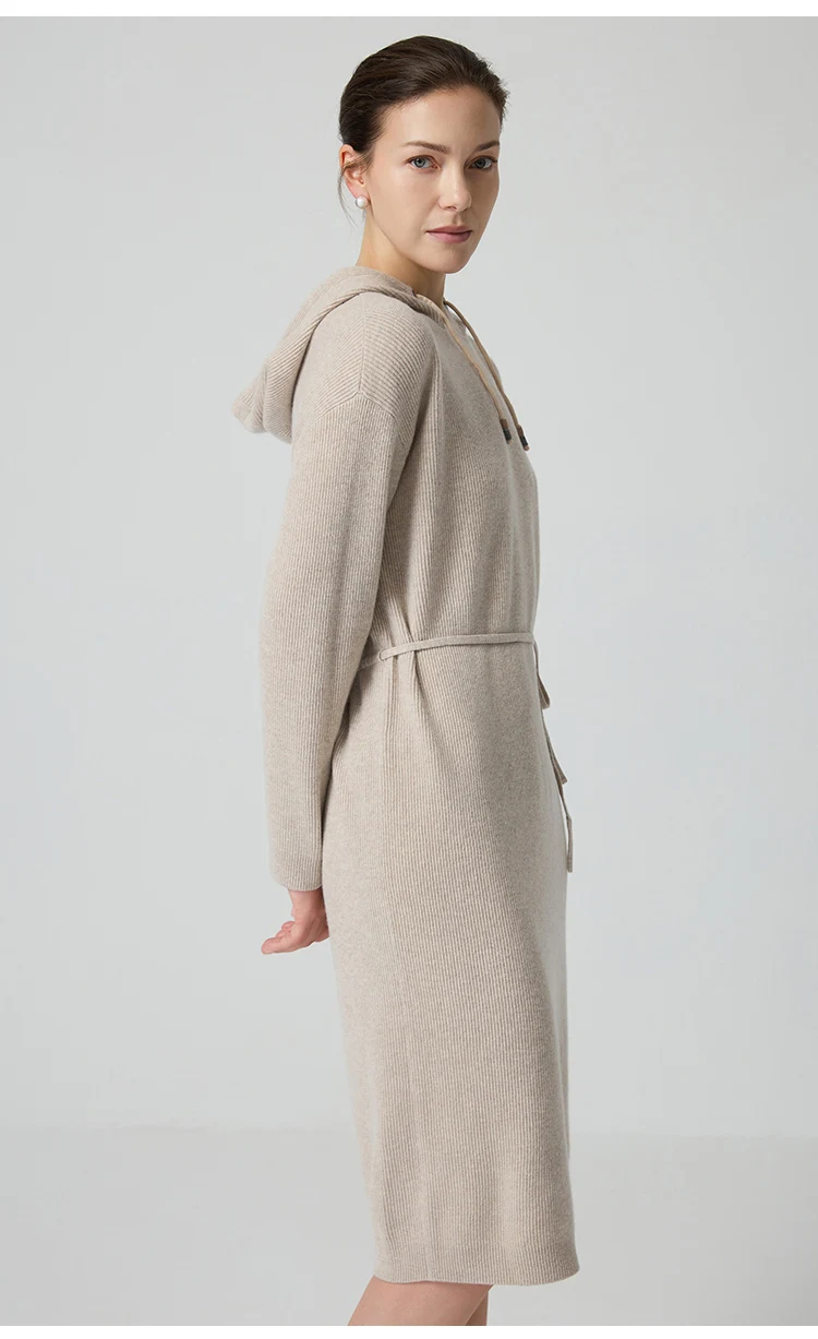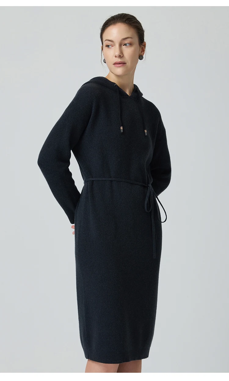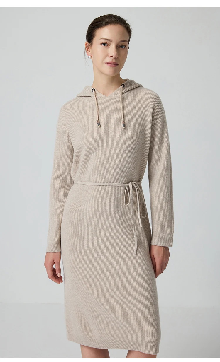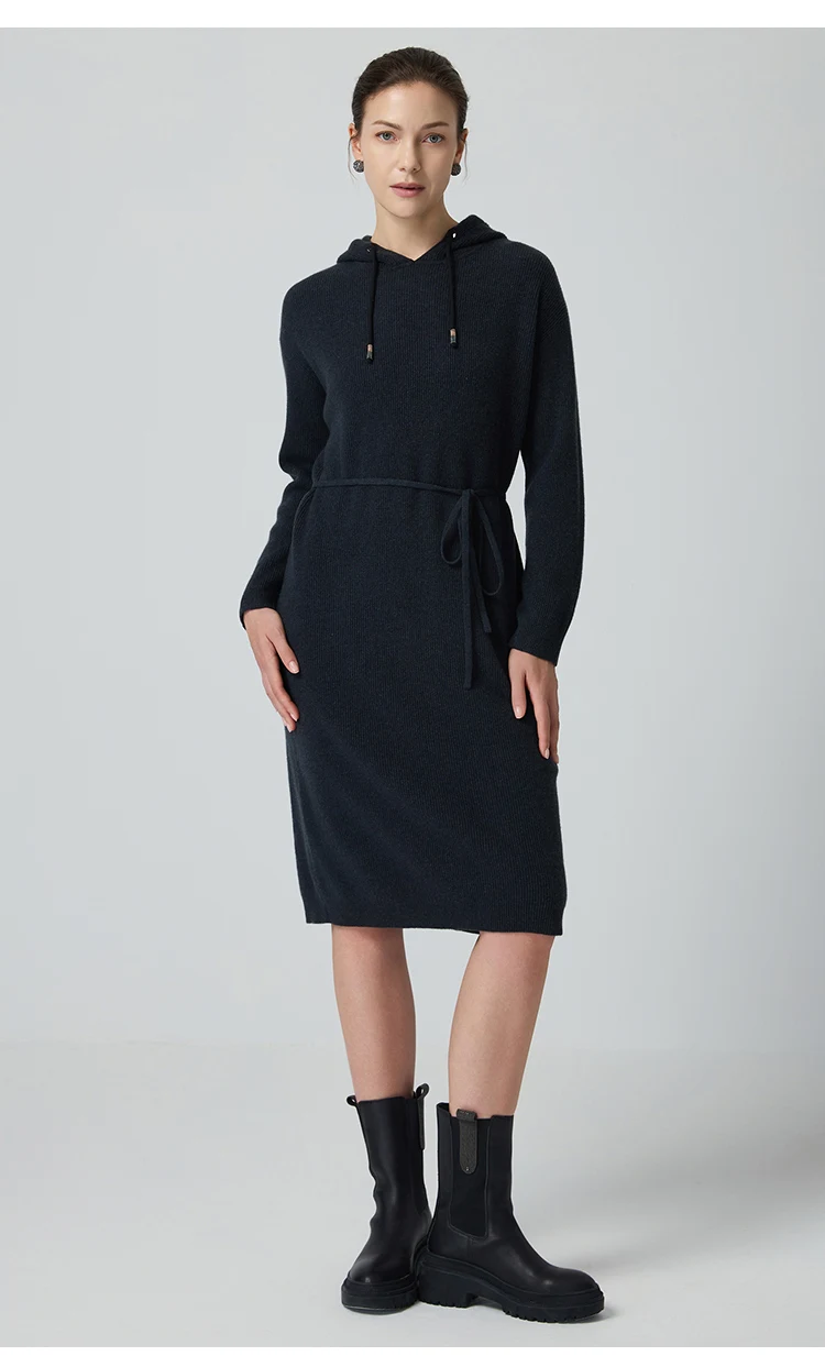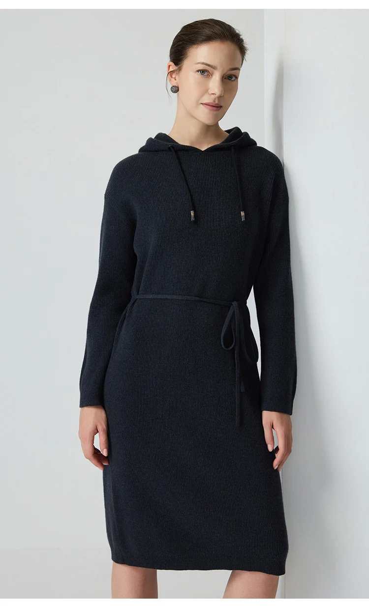 BY3521369 Luxury 100% Merino Wool Sweater Dress Fine 12-Gauge Knit Hoodie Style Drawstring And Belted Waist