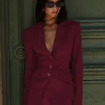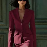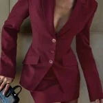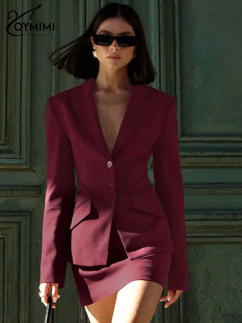 Oymimi Fashion Wine Red Two Piece Set For Women Elegant Long Sleeve Single Breasted Blazers And Slim Simple Mini Skirts Sets