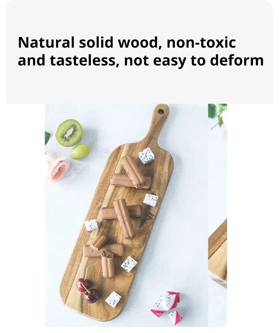 No painting, no waxing, safe and non-toxic.Cut fruits and vegetables on the front and cooked food on the back, clean and hygienic.Natural wood grain, each product is unique.Natural solid wood, non-toxic and tasteless, not easy to deform.Easy to clean, and not easy to crack.Hanging hole design, easy to store and save space.Solid wood tray, strong toughness, thick and textured.