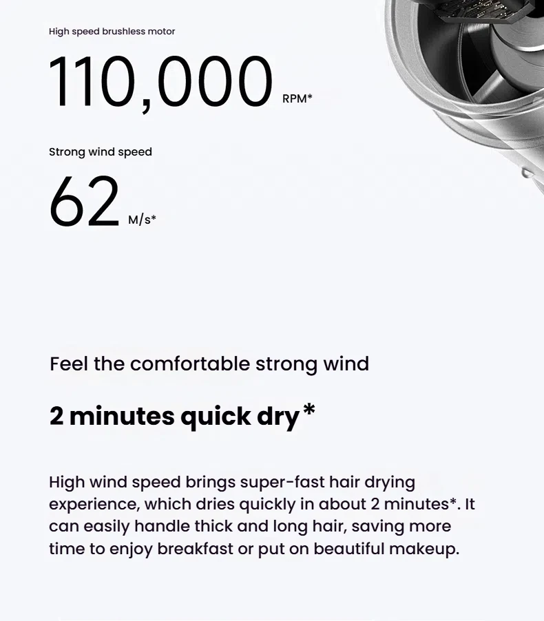 Powerful Airflow – 62m/s wind speed reduces drying time significantly.